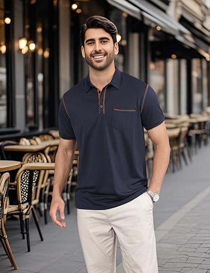 - 【Designed】V-neck, short sleeves, slim longline cut, simple and fashionable, stretchable, breathable, lightweight, durability, soft and comfortable to wear in all days and full range of movement.Delicate front pocket button design make these Men’s long sleeve polo shirts more classy,high stretch,no pilling and no wrinkling,convenient to wear,pair it jeans, casual pants for a stylish look.