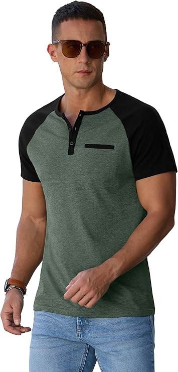 - Design: Men raglan casual stylish t-shirts. Three buttons design with pocket. Snip the threads to open. Contrast for a rugged look. A classic tees will never go out of style.